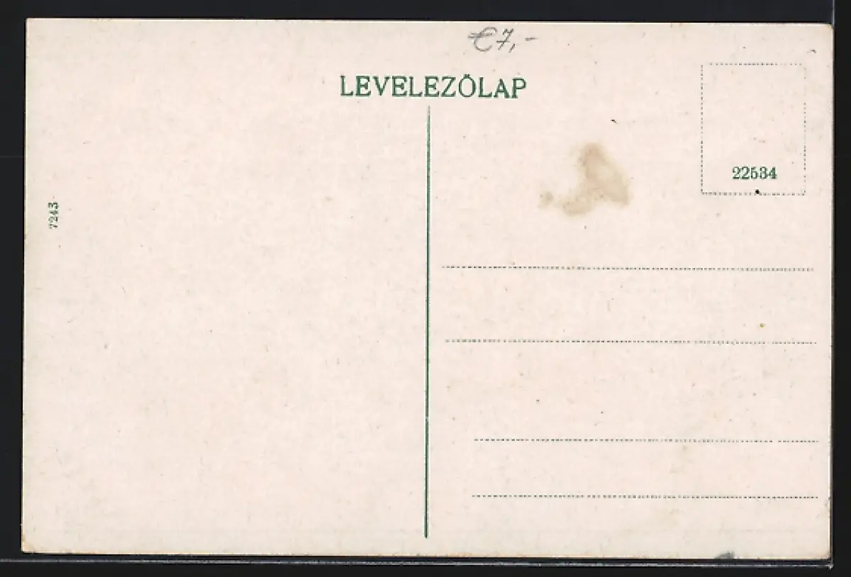 Personenbezogene Daten auf der Rückseite der Karte wurden durch blauen Textmarker unkenntlich gemacht. Die blauen Stellen sind auf die Vorderseite durchgeweicht und wirken sich negativ auf das Postkartenfoto aus