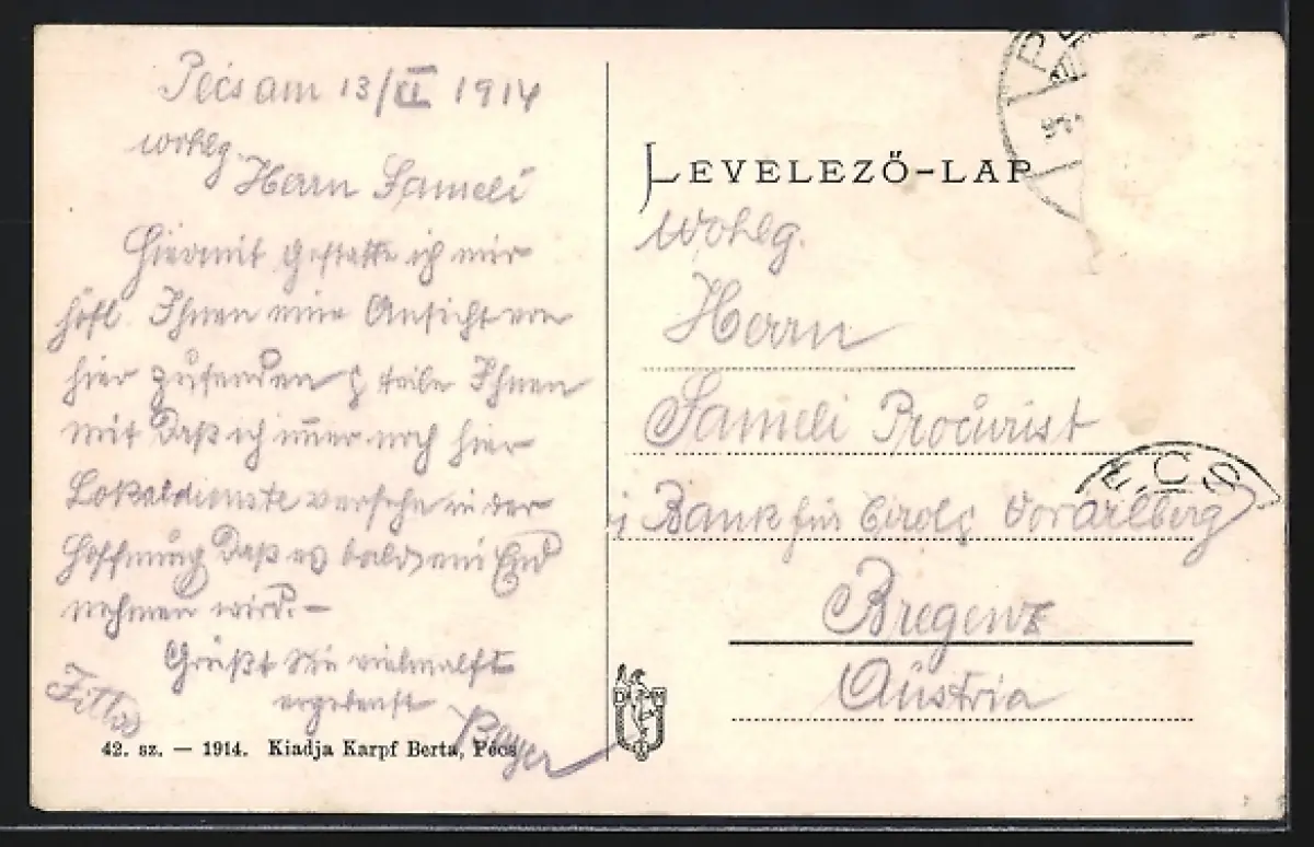 gelaufen 1914, Briefmarke entfernt, Bugspur li. oben, guter Zustand
