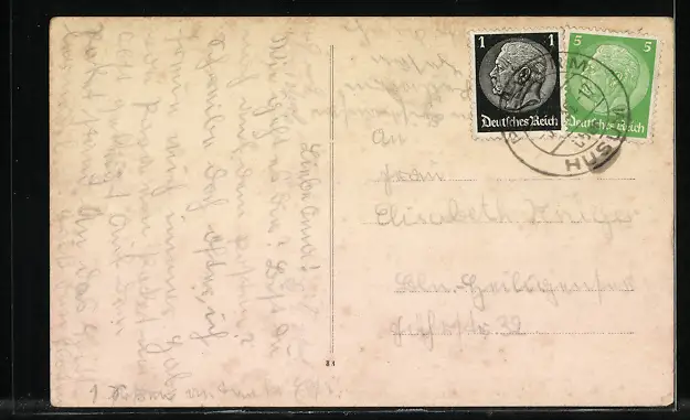 Personenbezogene Daten auf der Rückseite der Karte wurden durch blauen Textmarker unkenntlich gemacht. Die blauen Stellen sind auf die Vorderseite durchgeweicht und wirken sich negativ auf das Postkartenfoto aus