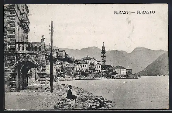 AK Perast, Ortsansicht mit Kirche und Bergpanorama