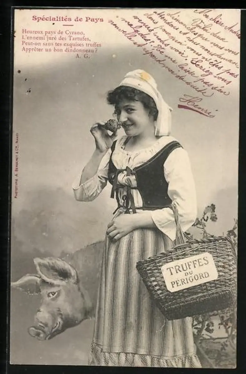AK Perigord, Trüffelsammlerin mit ihrem Trüffelschwein