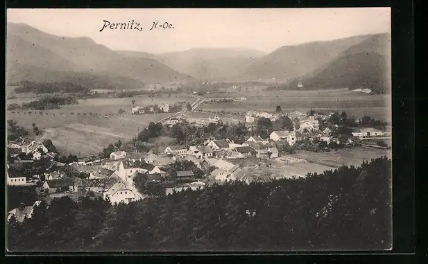 AK Pernitz, Ortsansicht mit Bergblick aus der Vogelschau