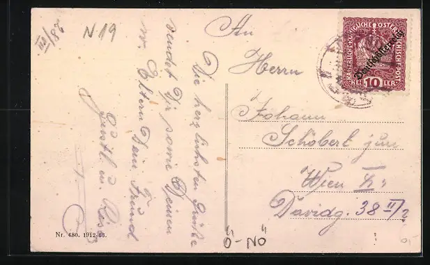 Personenbezogene Daten auf der Rückseite der Karte wurden durch blauen Textmarker unkenntlich gemacht. Die blauen Stellen sind auf die Vorderseite durchgeweicht und wirken sich negativ auf das Postkartenfoto aus