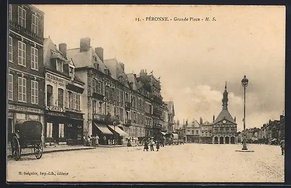 AK Péronne, Grande Place avec bâtiments historiques et calèche