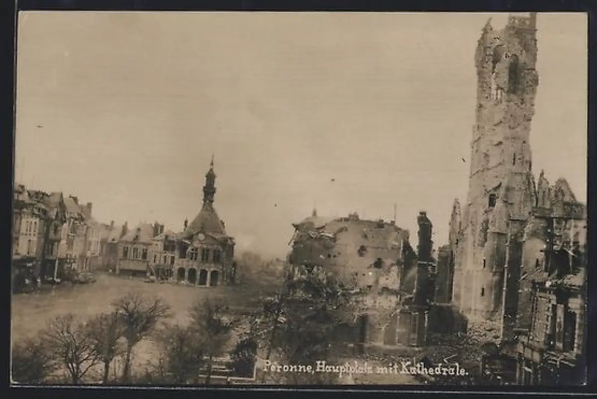 AK Péronne, Hauptplatz mit Kathedrale in Trümmern