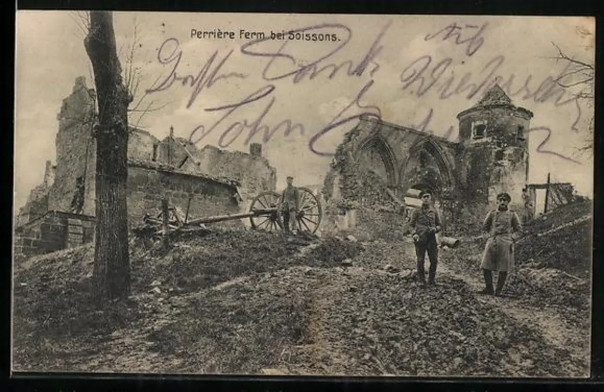 AK Perrière bei Soissons, Soldaten vor den Ruinen