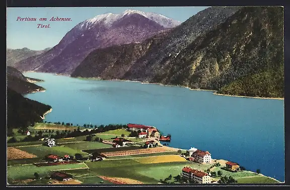 AK Pertisau am Achensee, Totalansicht mit Wasser und Bergen aus der Vogelschau