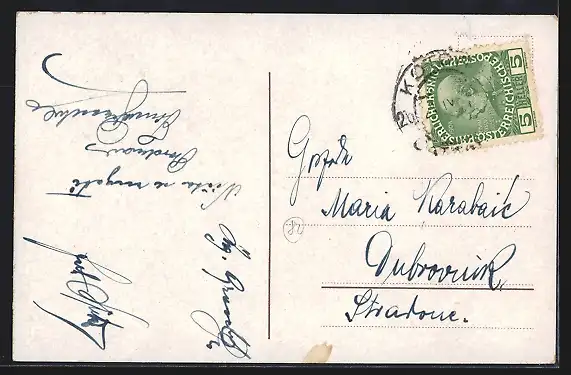 Personenbezogene Daten auf der Rückseite der Karte wurden durch blauen Textmarker unkenntlich gemacht. Die blauen Stellen sind auf die Vorderseite durchgeweicht und wirken sich negativ auf das Postkartenfoto aus