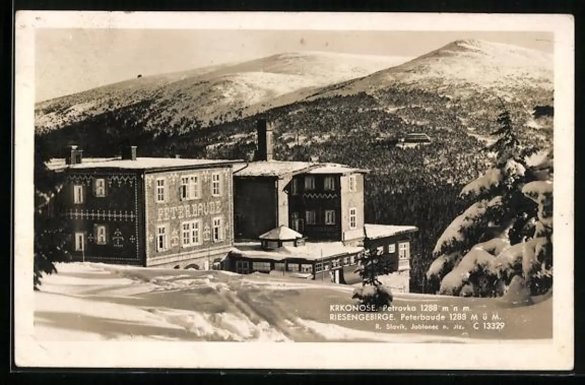 AK Peterbaude /Riesengebirge, Peterbaude mit Bergpanorama