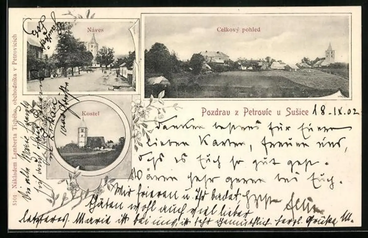 AK Petrovice u Susice, Kostel, Náves, Celkovy pohled