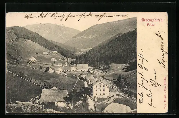 AK Petzer /Riesengebirge, Ortsansicht aus der Vogelschau