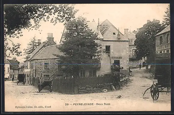 AK Peyrelevade, Deux Rues avec charrette ancienne et bâtiments en pierre