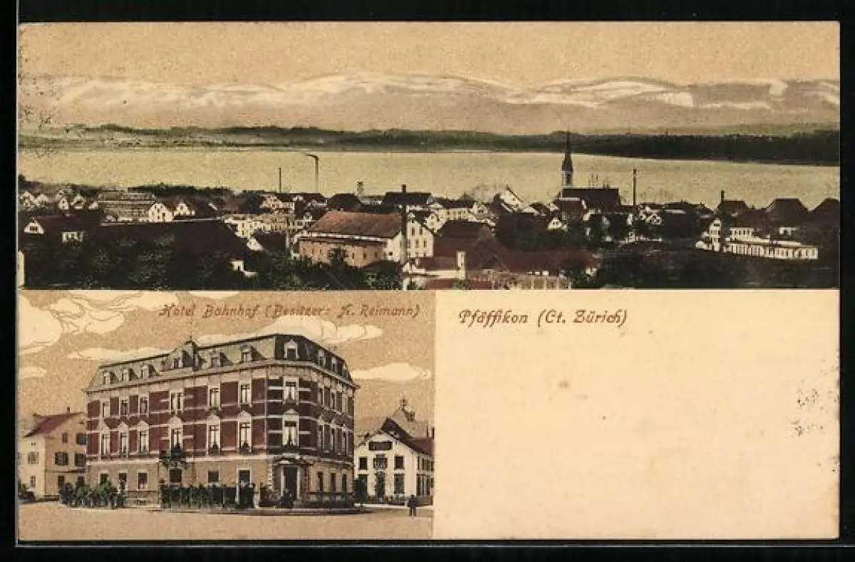 AK Pfäffikon /Zürich, Hotel Bahnhof, Bes. A. Reimann, Ortspanorama