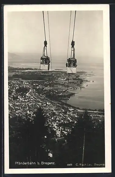 AK Pfänderbahn b. Bregenz, zwei Gondeln, Sicht auf den Ort