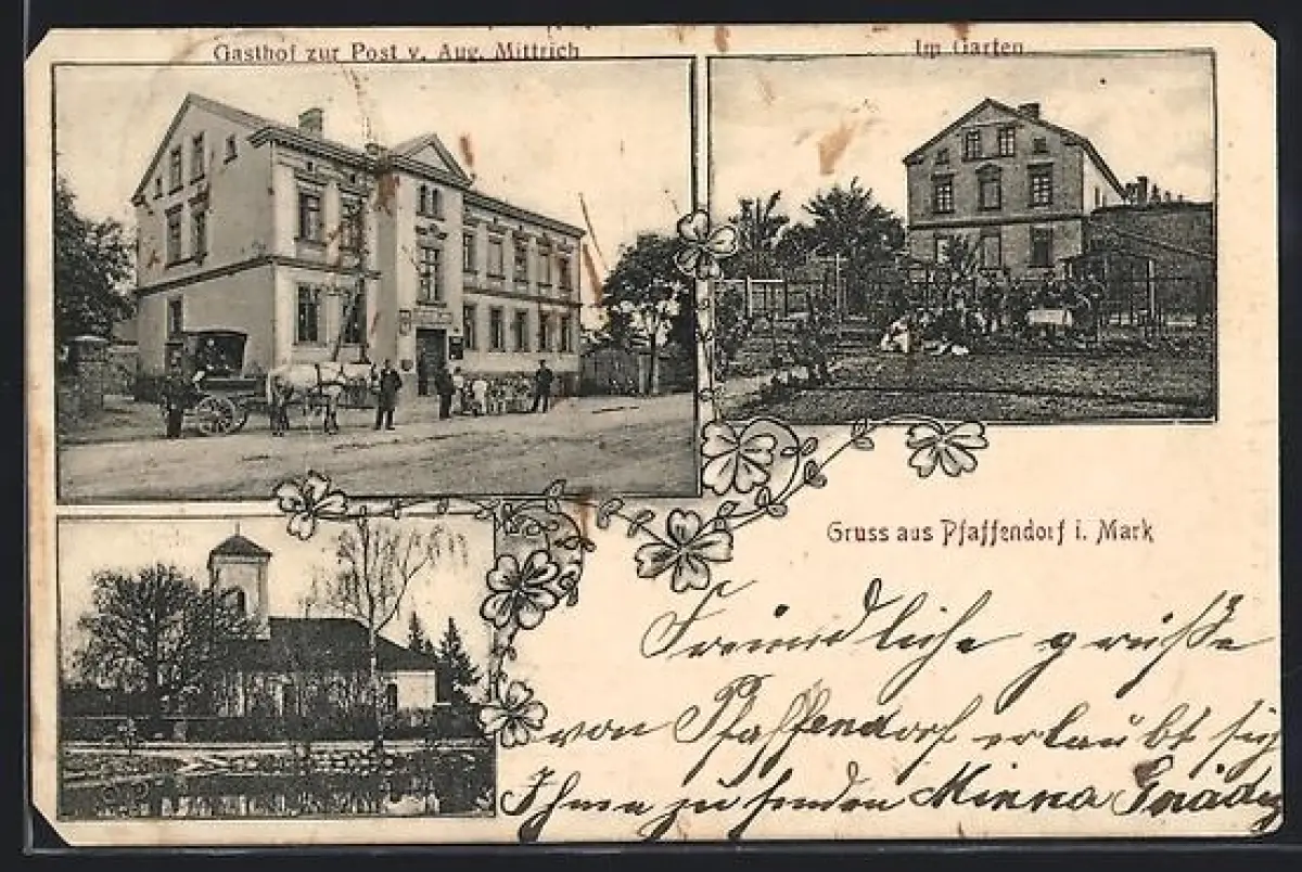 AK Pfaffendorf i. Mark, Gasthof zur Post, Garten, Kirche