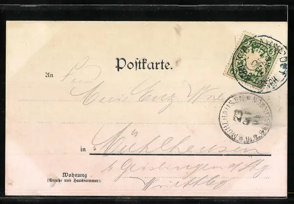 Personenbezogene Daten auf der Rückseite der Karte wurden durch blauen Textmarker unkenntlich gemacht. Die blauen Stellen sind auf die Vorderseite durchgeweicht und wirken sich negativ auf das Postkartenfoto aus