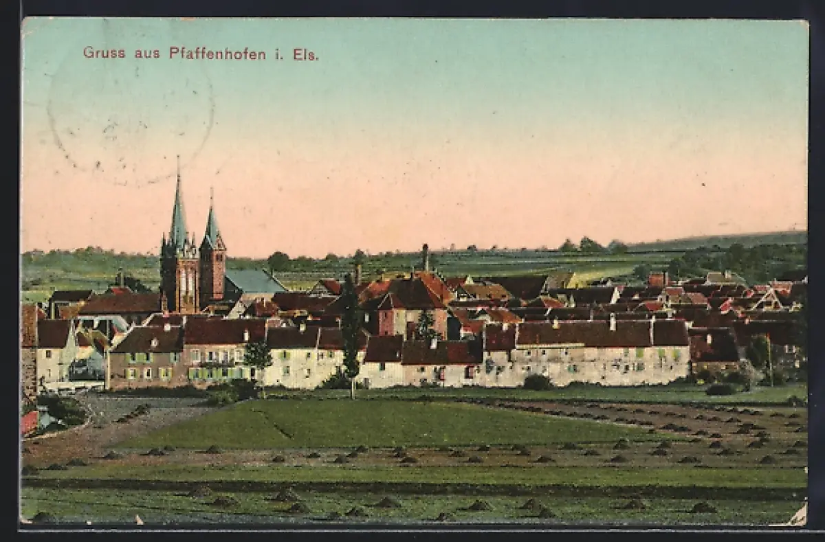 AK Pfaffenhoffen i. Els., Vue sur le village avec l`église et les champs environnants