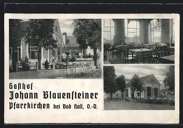 AK Pfarrkirchen, Gasthof Johann Blauensteiner mit Innenansicht und Terrasse