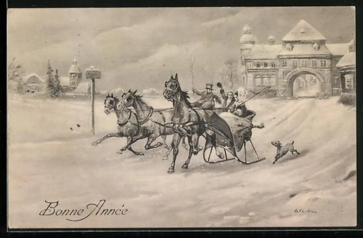 AK Pferdeschlittenfahrt vor dem Tor einer Stadt, Neujahrsgruss
