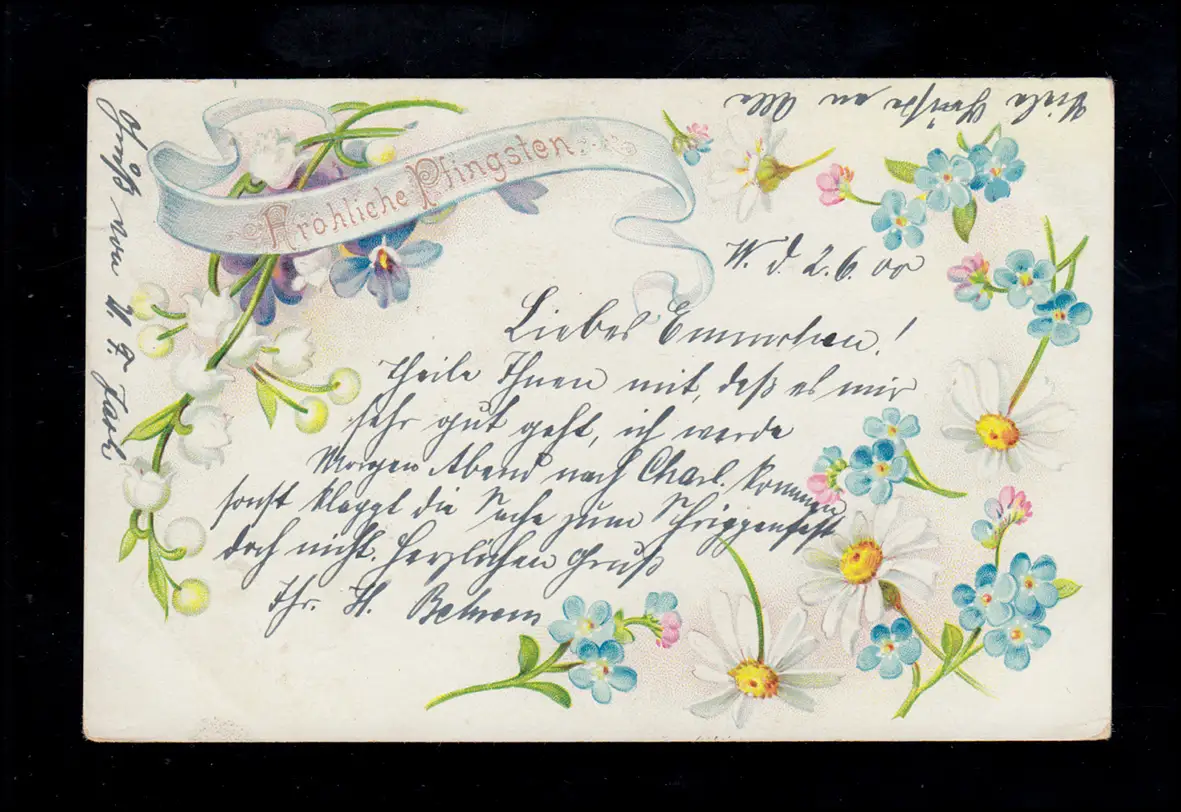 AK Pfingsten: Glückwunschschleife mit Blumen, WILDPARK 1.6.1900
