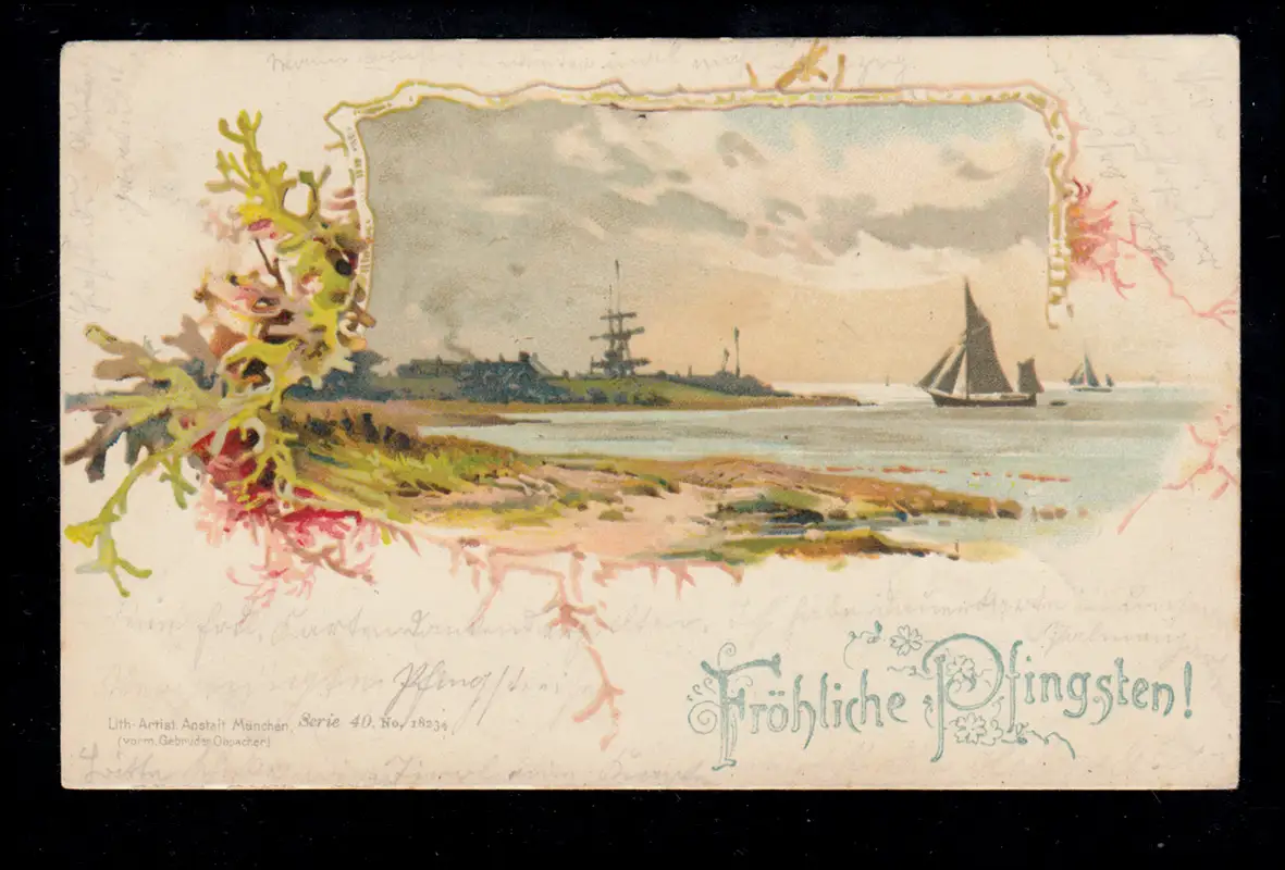 AK Pfingsten: Küstenlandschaft mit Segelbooten LEIPZIG 17.5.99 n. MÜNCHEN 18.5.