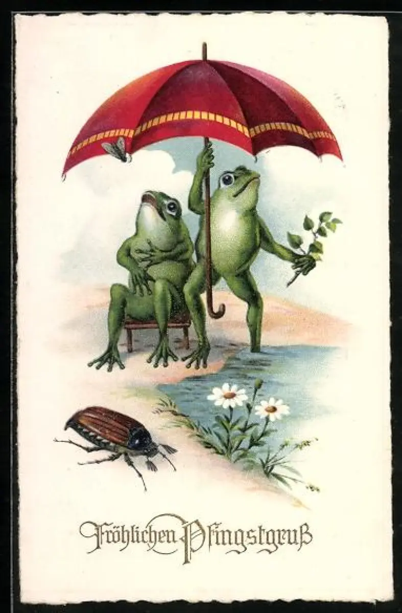 AK Pfingstgruss, Frösche mit Sonnenschirm und Maiköfer