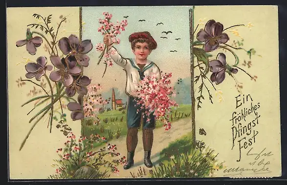 AK Pfingstgruss, Junge im Matrosenanzug mit Blumenstrauss