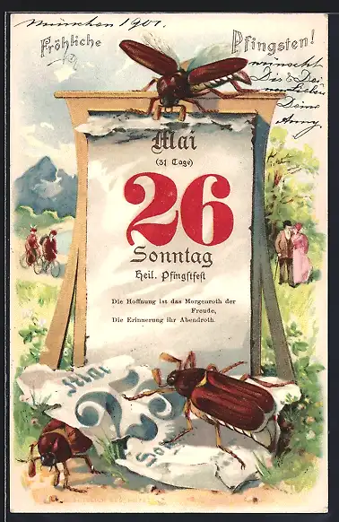 AK Pfingstgruss, Maikäfer klettert auf Kalender, Kalenderblatt 26. Mai, Fahrradfahrer