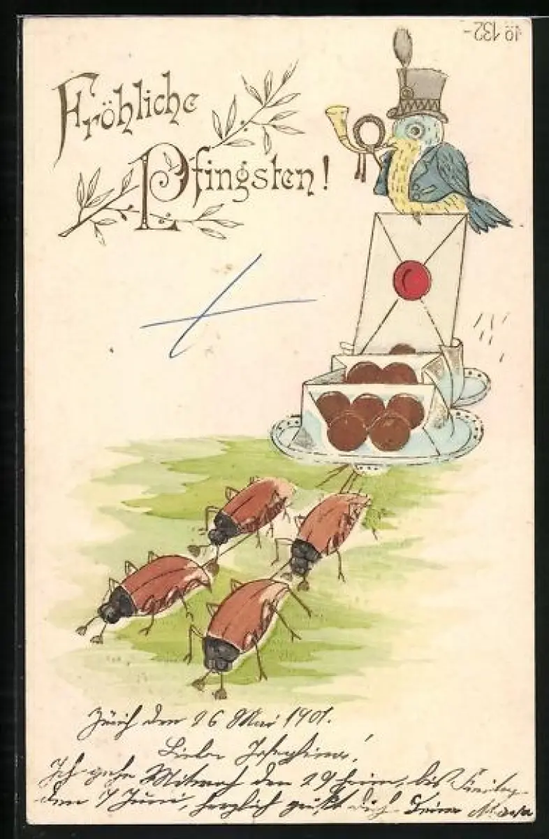 AK Pfingstgruss, Maikäfer ziehen Kugeln auf einem Tablett, Vogel mit Posthorn