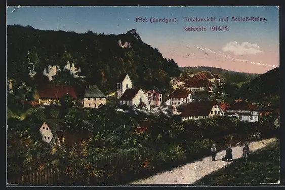 AK Pfirt /Sundgau, Totalansicht und Schloss-Ruine, Gefechte 1914-15