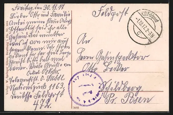 gelaufen 1917, Eckknick li. oben, Bugspur re. oben, guter Zustand