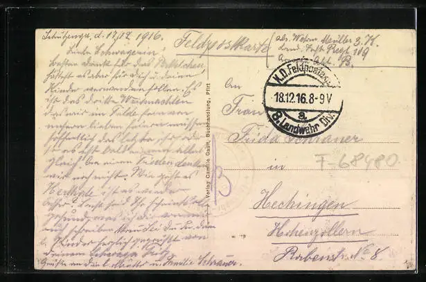 alte Ansichtskarte, gelaufen 1916 als Feldpost, Eckknick li. oben, Stempelspur, guter Zustand
