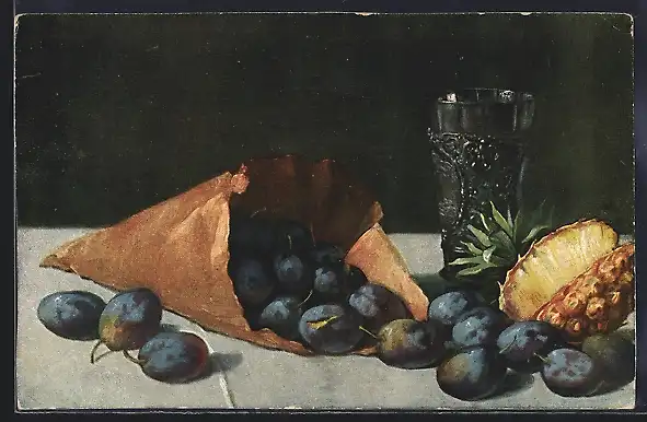 AK Pflaumen in einer Tüte und eine aufgeschnittene Ananas