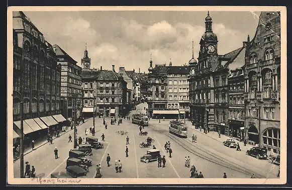 AK Pforzheim, Marktplatz mit Strassenbahnen, Geschäfts- und Häuserfassaden