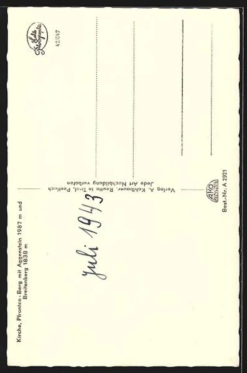 Personenbezogene Daten auf der Rückseite der Karte wurden durch blauen Textmarker unkenntlich gemacht. Die blauen Stellen sind auf die Vorderseite durchgeweicht und wirken sich negativ auf das Postkartenfoto aus
