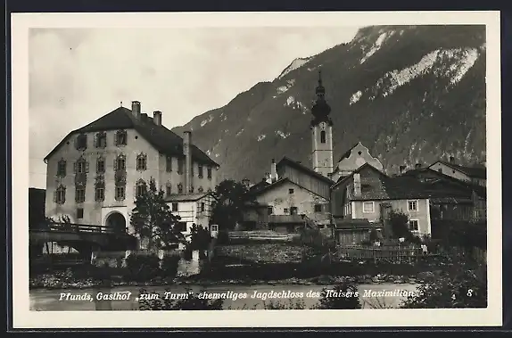 AK Pfunds, Gasthof Zum Turm - ehemaliges Jagdschloss des Kaisers Maximilian