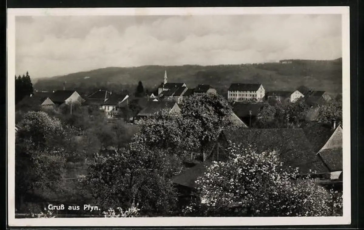AK Pfyn, Ortsansicht aus der Vogelschau, mit Turmgebäude