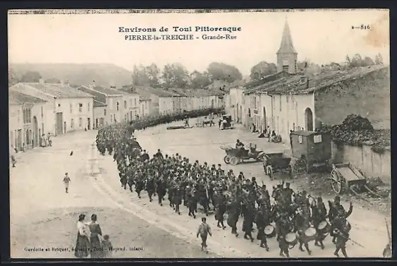 AK Pierre-la-Treiche, Grande-Rue avec défilé militaire et voitures anciennes