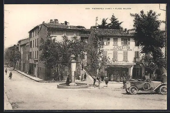 AK Pierrefeu, Place Wilson avec fontaine et voiture ancienne