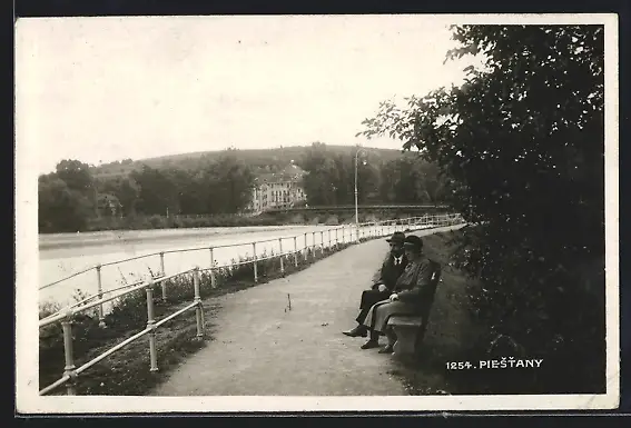AK Piestany, Uferpromenade mit Paar auf einer Bank