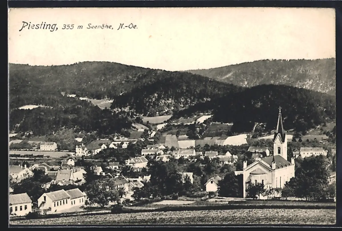 AK Piesting /N.-Ö., Totalansicht mit Kirche aus der Vogelschau