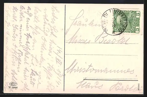 Personenbezogene Daten auf der Rückseite der Karte wurden durch blauen Textmarker unkenntlich gemacht. Die blauen Stellen sind auf die Vorderseite durchgeweicht und wirken sich negativ auf das Postkartenfoto aus