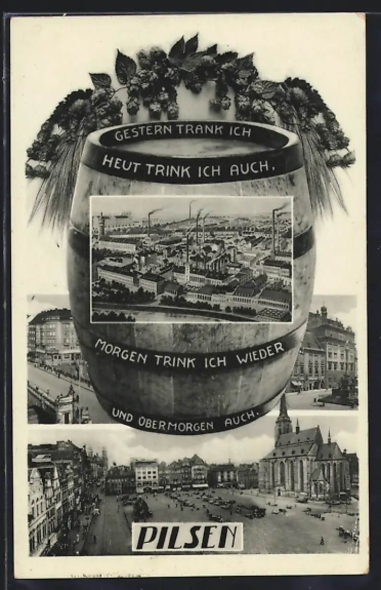 AK Pilsen, Brauhaus, Ortsansicht mit Kirche