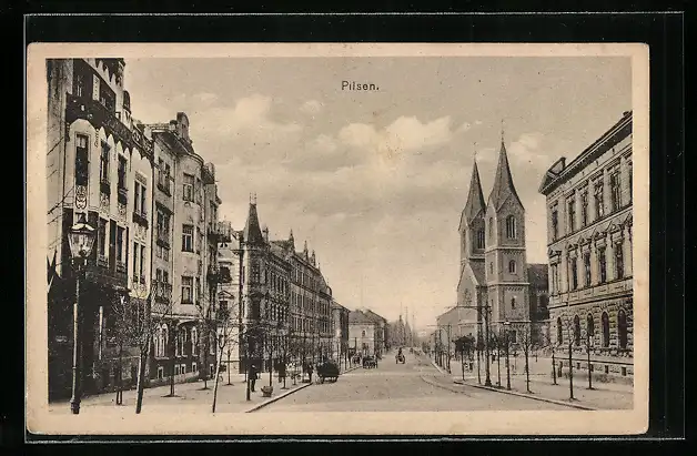 AK Pilsen, Strassenpartie mit Kirche