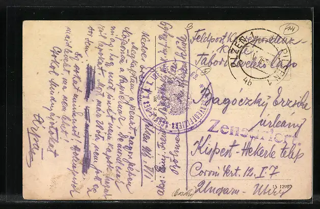 Personenbezogene Daten auf der Rückseite der Karte wurden durch blauen Textmarker unkenntlich gemacht. Die blauen Stellen sind auf die Vorderseite durchgeweicht und wirken sich negativ auf das Postkartenfoto aus