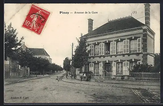 AK Piney, Avenue de la Gare avec bâtiments et passants
