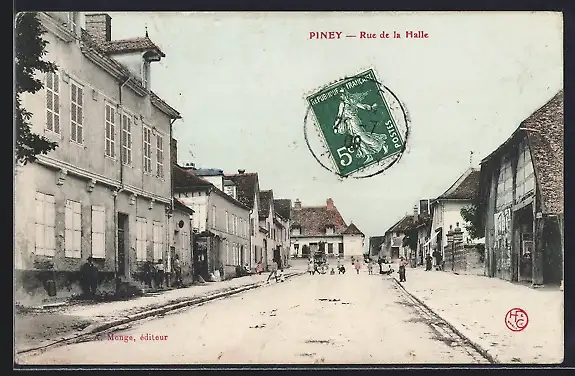 AK Piney, Rue de la Halle animée avec bâtiments anciens et passants