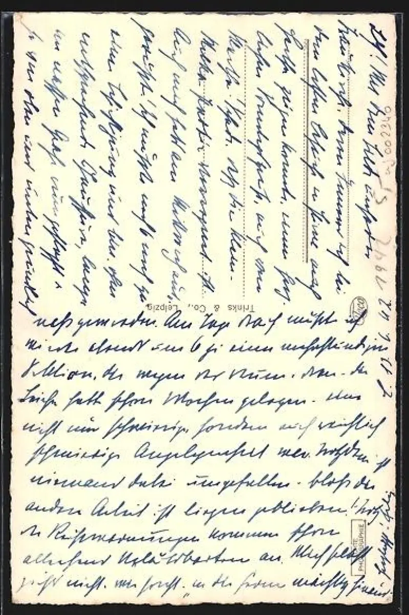 Personenbezogene Daten auf der Rückseite der Karte wurden durch blauen Textmarker unkenntlich gemacht. Die blauen Stellen sind auf die Vorderseite durchgeweicht und wirken sich negativ auf das Postkartenfoto aus