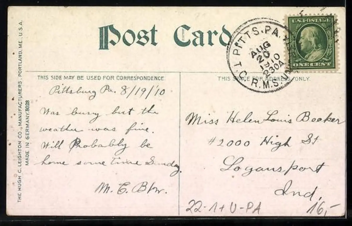 Personenbezogene Daten auf der Rückseite der Karte wurden durch blauen Textmarker unkenntlich gemacht. Die blauen Stellen sind auf die Vorderseite durchgeweicht und wirken sich negativ auf das Postkartenfoto aus