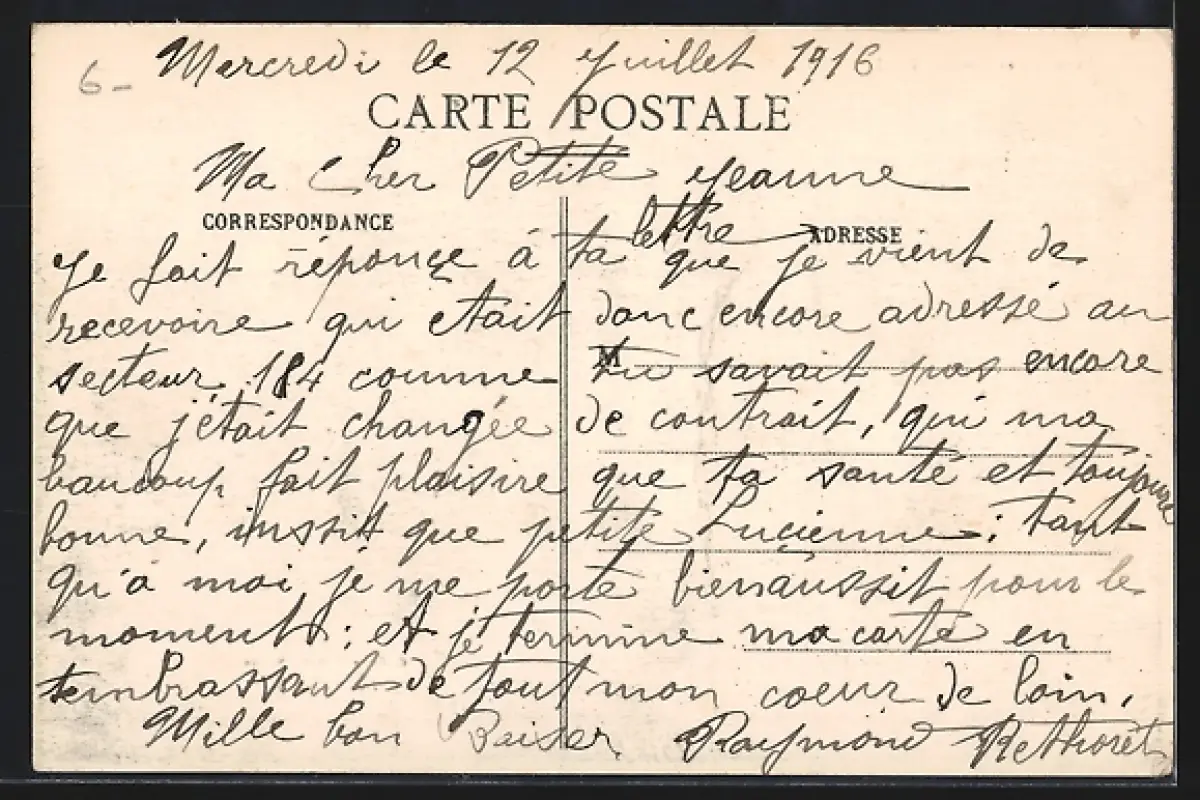 Personenbezogene Daten auf der Rückseite der Karte wurden durch blauen Textmarker unkenntlich gemacht. Die blauen Stellen sind auf die Vorderseite durchgeweicht und wirken sich negativ auf das Postkartenfoto aus